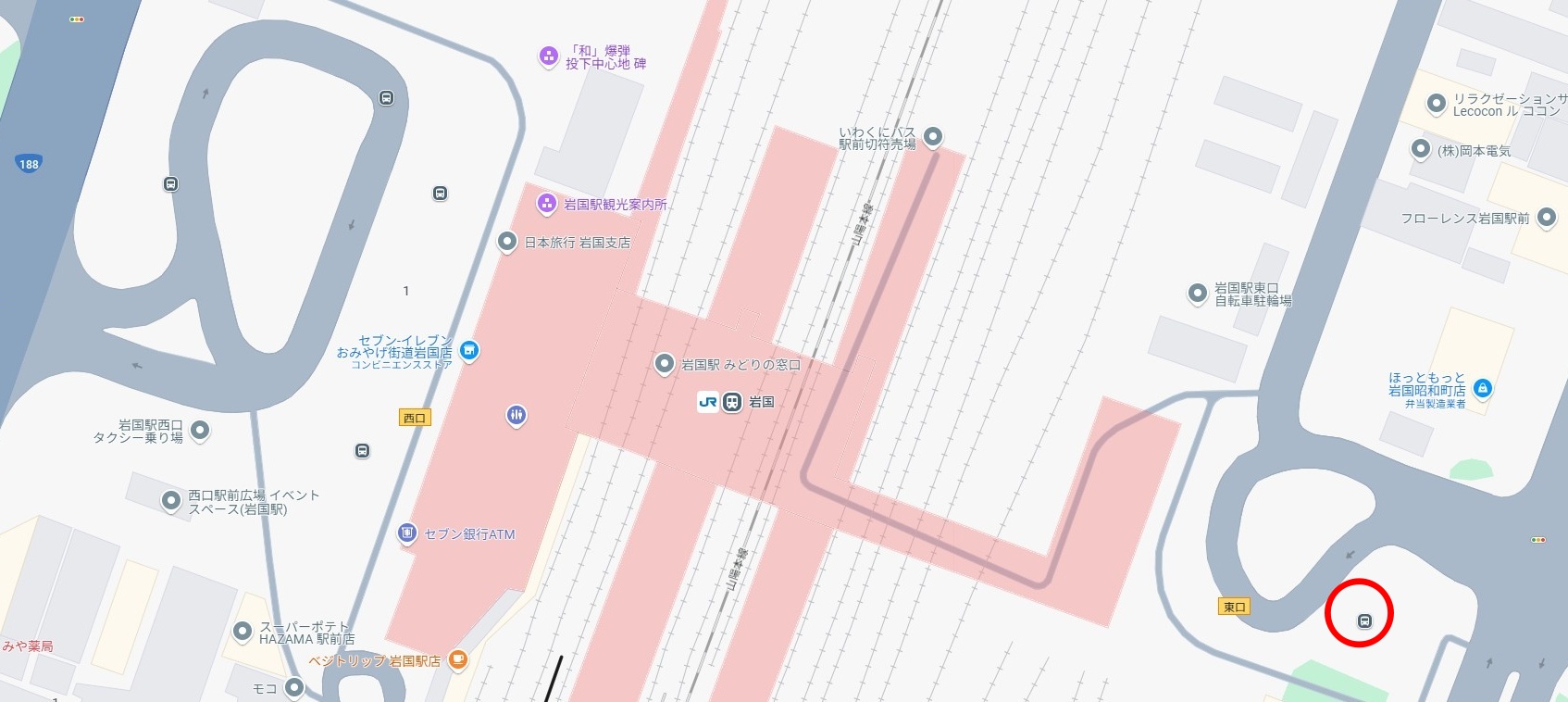 岩国錦帯橋空港を出発したバスは、岩国駅の東口に到着いたしました。(おおよその到着位置は、赤丸部分)