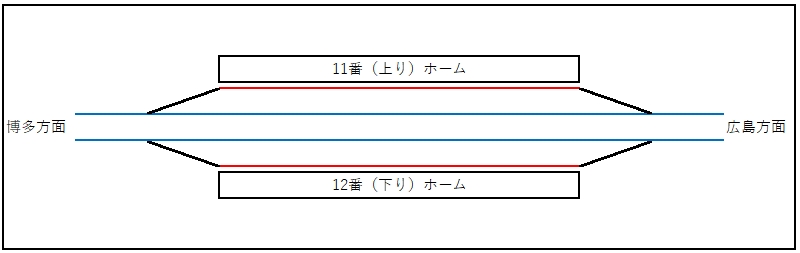 厚狭駅の新幹線ホームの構造ですが、真ん中に通過線が2線(上下線各1線)、外側に待避線が2線(上下線各1線)あり、待避線にはホームが設置されています。