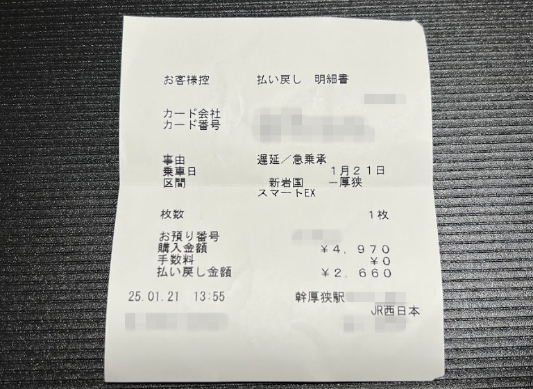 元々の運賃の内訳は、乗車券2310円、新幹線特急券2660円(合計4970円)でしたが、新幹線特急券の2660円が全額払い戻しされていました。