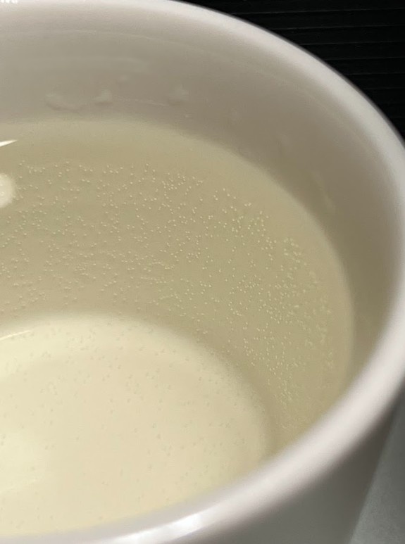 色は、やや黄色がかった色をしており、ガス(気泡)も確認できます。