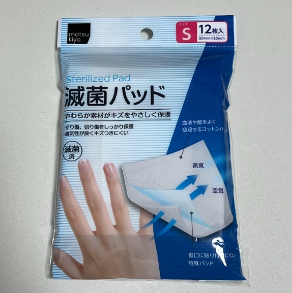 ドラッグストアでも手に入りますが、少ない単位では売っていませんでしたので、店頭にあった最小のSサイズ(5cm x 5cm)12枚入りを購入。