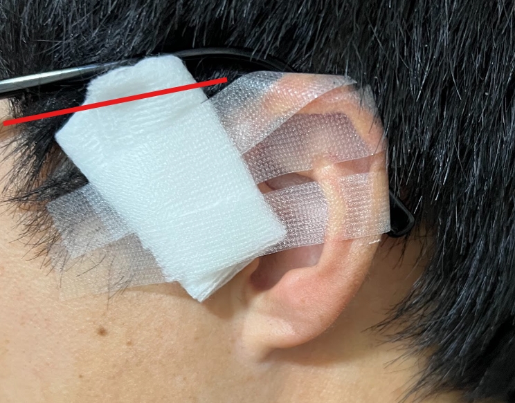 患部の位置やガーゼのつけ方によっては、メガネを掛けたときに斜めになってしまう可能性があります。