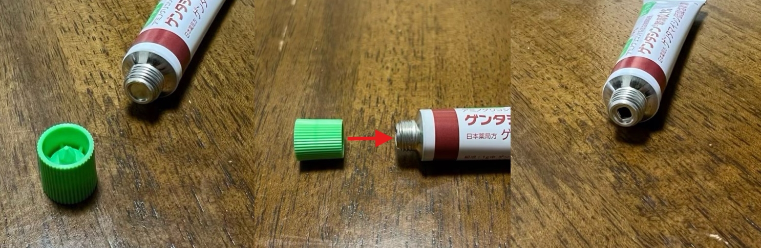 薬を出す方法は、フタの先のとがった方を画像のように差し込むと、穴を開けることができます。