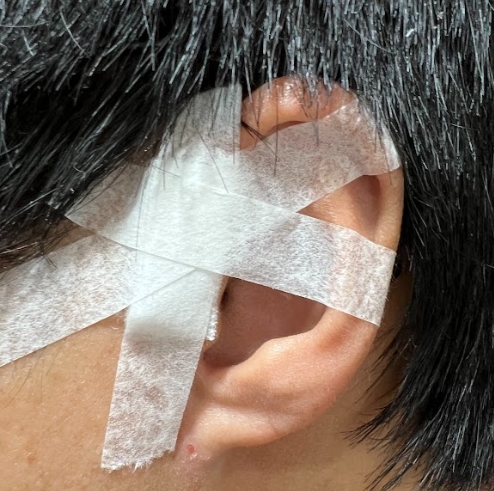 この写真は、術後の左耳を撮影したものですが、このテープは貼ったままの状態で、翌日も病院に行くこととなります。