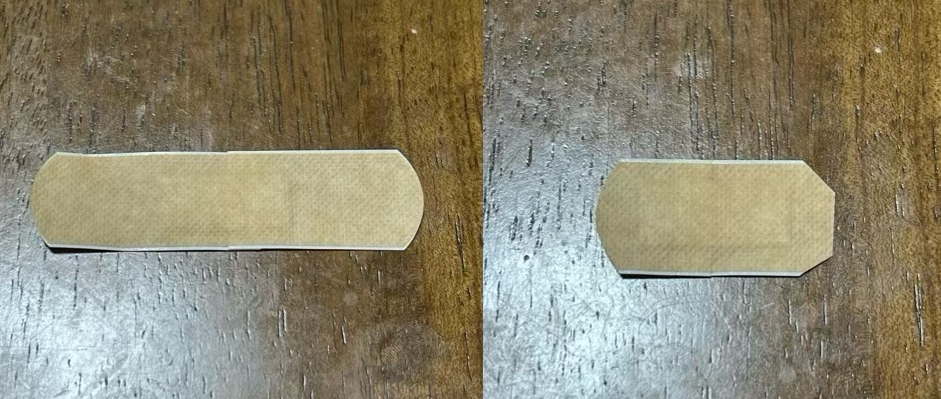 私は、家にあった普通の絆創膏の両端を切って使用していました。(もう少し小さいほうが理想だったのですが、バンドエイドのジュニアサイズ(子供用)でも両端を切る必要があったので、結局普通のサイズのものを使用)