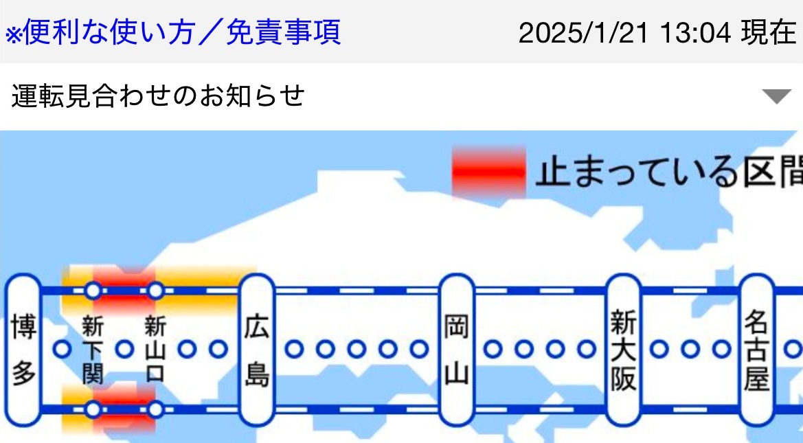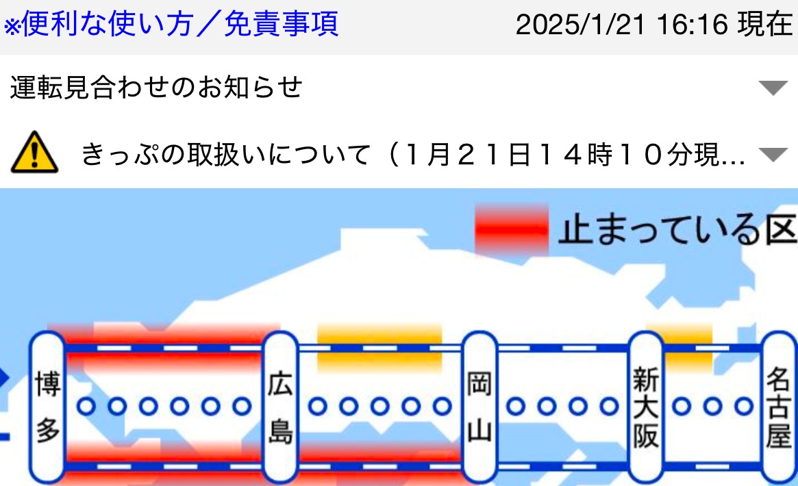 2025/01/21 16:16 現在の東海道・山陽新幹線運行状況です。